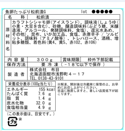 【原材料名】カラフトシシャモ卵(アイスランド)、調味液(しょうゆ(小麦・大豆を含む)、砂糖、醸造調味料(ぶどう糖、米醸造液、アルコール、発酵調味料、食塩)、還元水あめ、その他)、昆布、いか加工品、食塩、赤唐辛子 / ソルビット、調味料(アミノ酸等)、トレハロース、酒精、増粘多糖類、着色料(黄4、黄5、赤102、赤106)