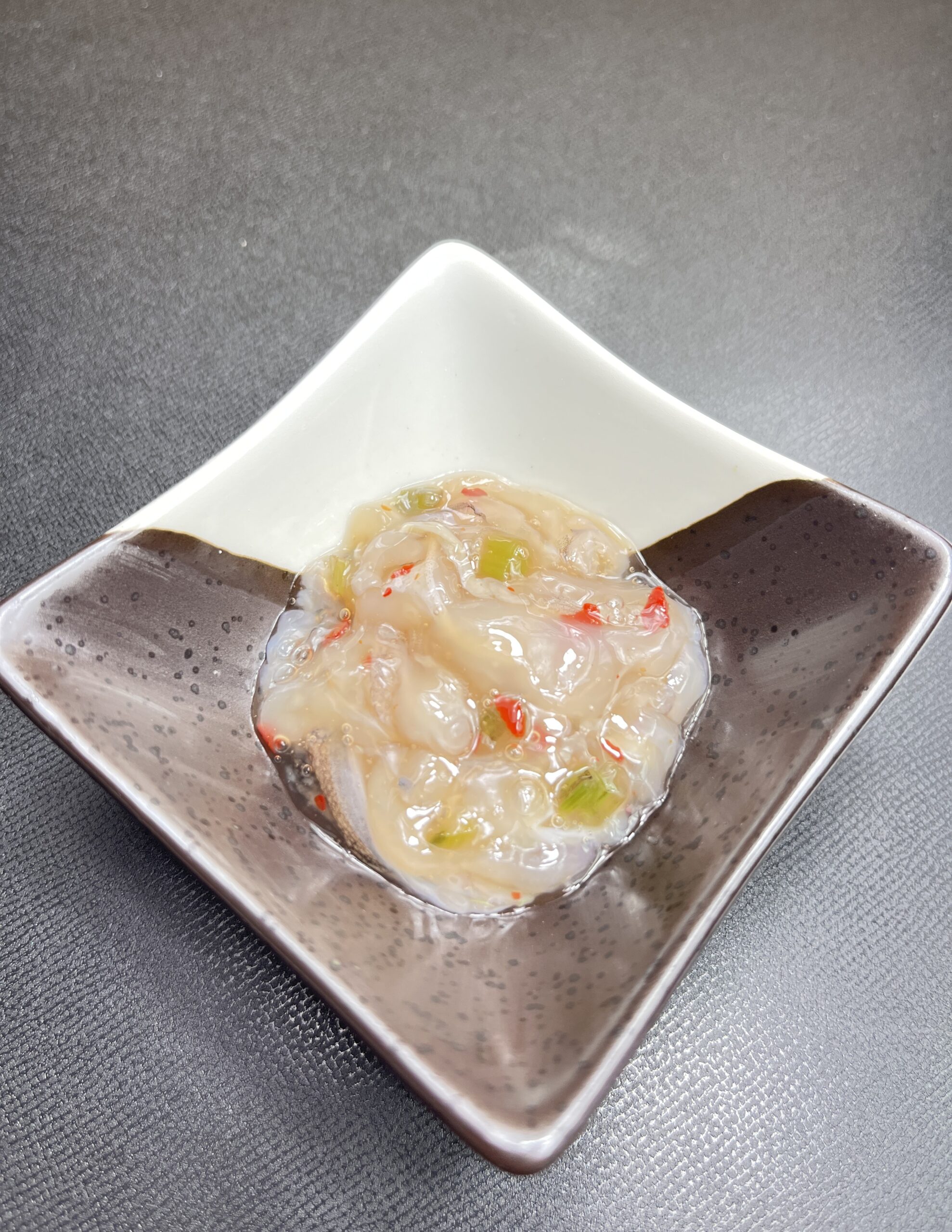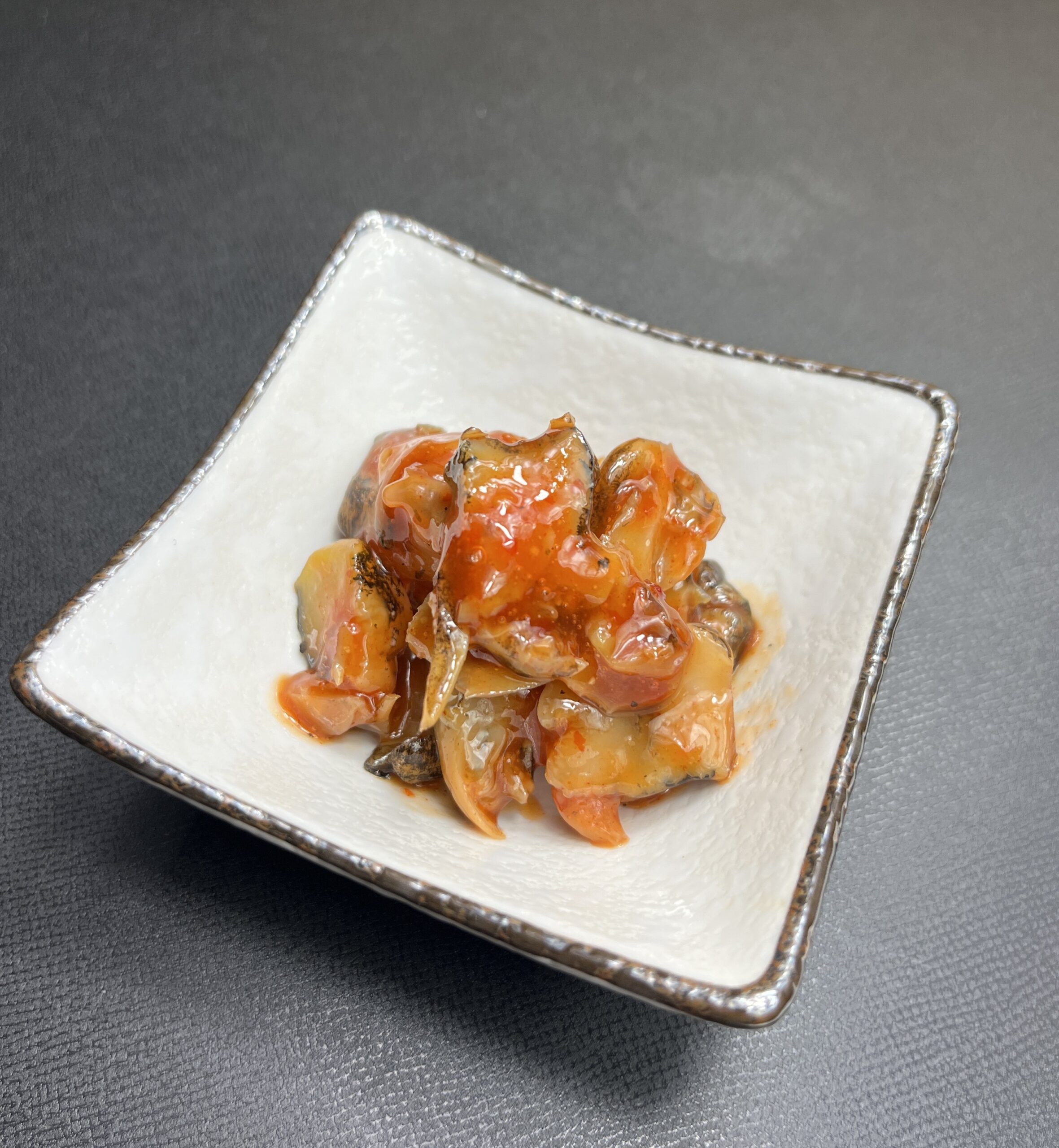 【原材料名】アヤボラ貝(北海道)、砂糖、醸造調味料(ぶどう糖、米醸造調味料(ぶどう糖、米醸造液、アルコール、発酵調味料、食塩)、豆板醤(塩蔵唐辛子、そら豆加工品、乾燥唐辛子、食塩)、コチジャン(大豆を含む)、食塩、アミノ酸液調味料/ソルビット、調味料(アミノ酸等)、トレハロース、酒精、pH調整剤、増粘多糖類、酸化防止剤(V.C)