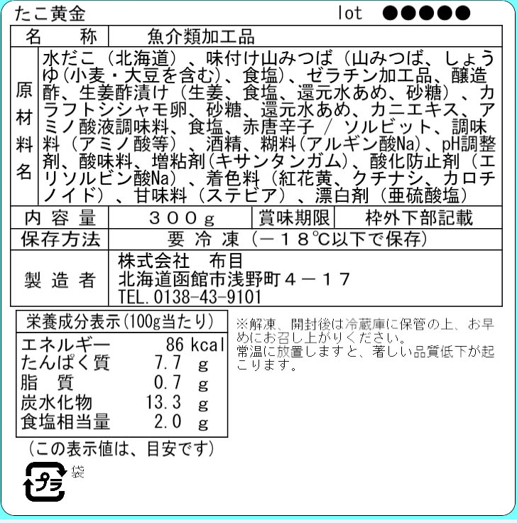 北海道の水だこに、みつば・生姜・シシャモ卵を混ぜ合わせ、さっぱりと甘酢で仕上げています。箸休めにはもちろん暑い日にもオススメな商品です。