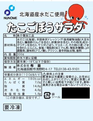 【原材料名】水だこ(北海道)、半固体状ドレッシング(食用植物油脂(大豆を含む)、醸造酢(りんごを含む)、卵黄(卵を含む)、その他(乳成分・ゼラチンを含む)、サラダ(ごぼう、マヨネーズ、その他(小麦・ごまを含む)、にんじん、食塩 / 増粘剤(加工でん粉、増粘多糖類)、pH調整剤、調味料(アミノ酸)、グリシン、香辛料抽出物、香料